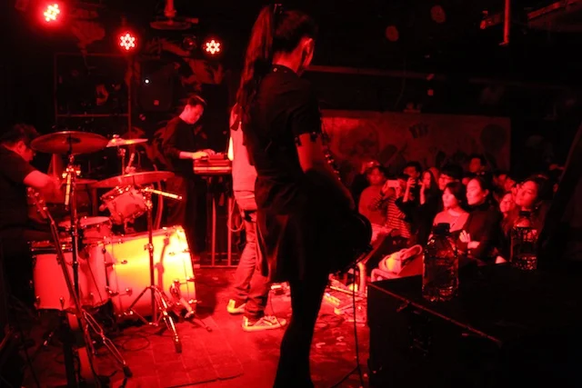 The overall result is transportive—the band definitely lives up to its hype of creating a dreamy, hypnotic, psychedelic sound. There’s also some straight up rock and even folk thrown into the mix with Zhang Wei on guitar. Whether or not the recordings hold up I don’t know, but live on stage with a good sound system, this is a great band to see. The audience was as always a healthy mix of foreigners and Chinese (mostly the latter) and largely a youthful crowd (I’m feeling more and more like a dinosaur when I attend these sorts of events). The club has seats in the back but near the stage it’s standing room only, and folks were swaying and shaking to the music as if in a trance. The lighting was also cool with a mix of blues and reds, which made it hard to capture images of the band, but I managed to catch a few good ones on my SLR.